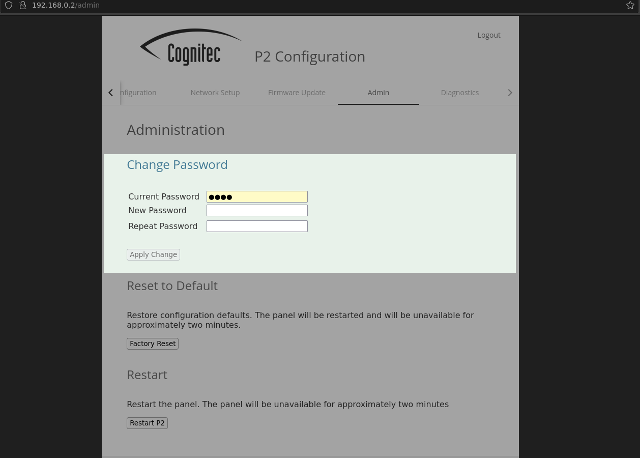 Each P2 panel is delivered with the same default password to log in to the web interface. For security reasons, Cognitec recommends that you change the password immediately after the first login.